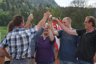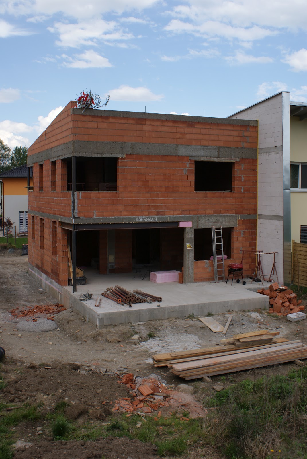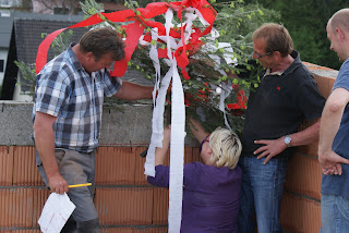 Normalerweise macht man das Richtfest erst wenn der Dachstuhl oben ist aber wer uns kennt der weiß, dass wir einfach nicht unbedingt normal sind ;-) und deshalb haben wir unser Richtfest einfach mal auf den Fenstertag gelegt denn wir hatten am Montag den höchsten Punkt beim Mauern erreicht *staun*.