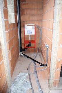 Die Installateure haben ganze Arbeit geleistet und somit "hängen" mittlerweile die WC-Spültanks, die Leitungen für die Wasseranschlüsse liegen in den WC's, in der Küche und im Bad. Zusätzlich ist im Bad bereits die Wandheizung angebracht.